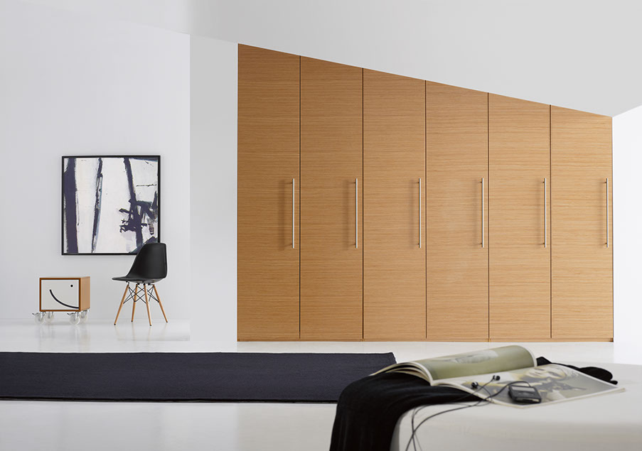 Portes battantes mod. P1 en feuille de chêne RW 19 mm (horizontale); poignée tubulaire réf. 930 anodisé argent