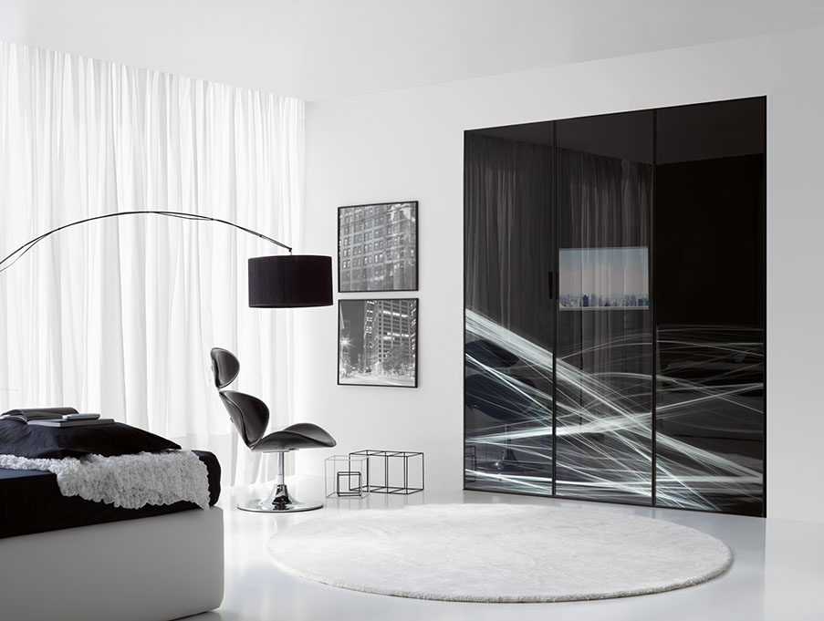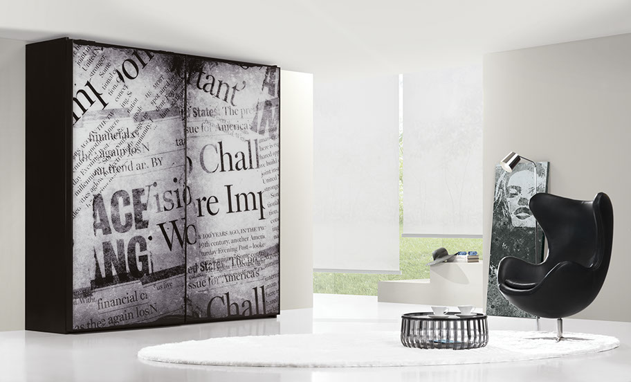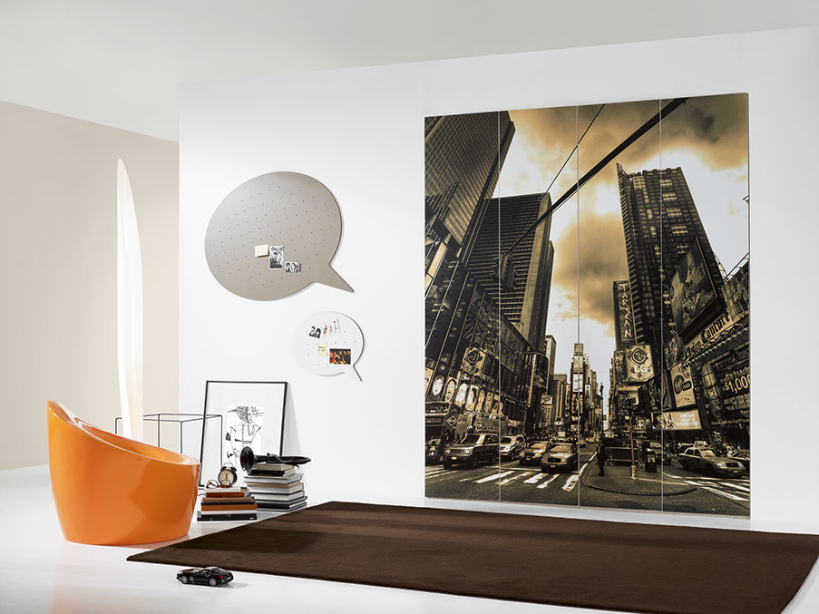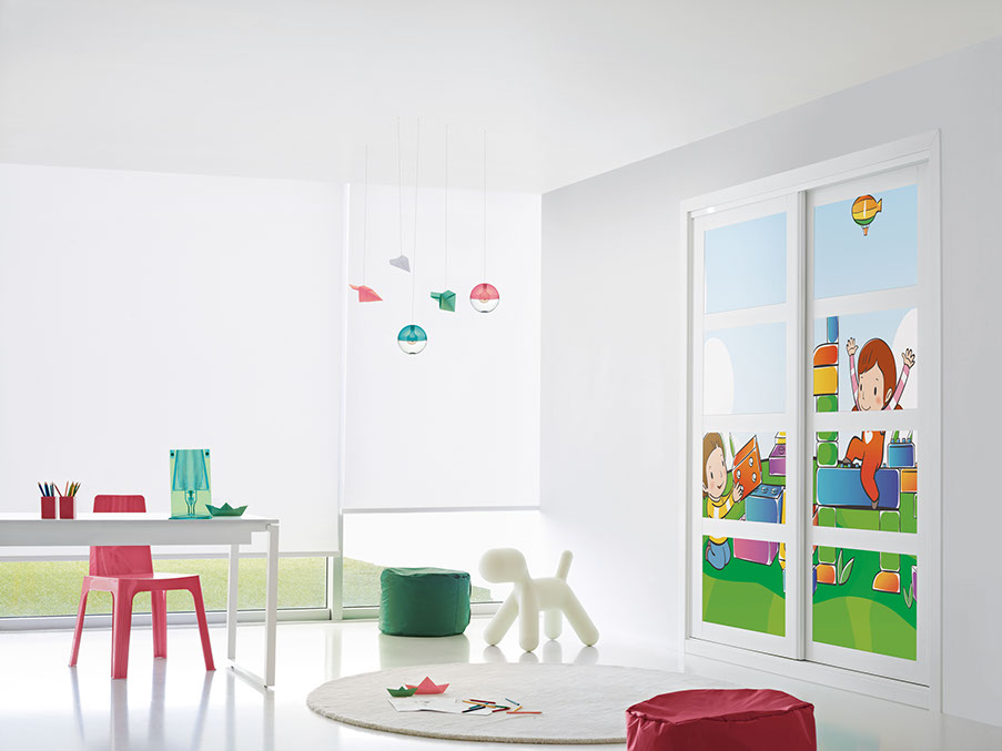 Portes coulissantes mod. P4m avec illustration personnalisée, appliquée sur verre de 4mm; profil poignée série 400 en mélaminé blanc B010MA et cadre de 70mm.