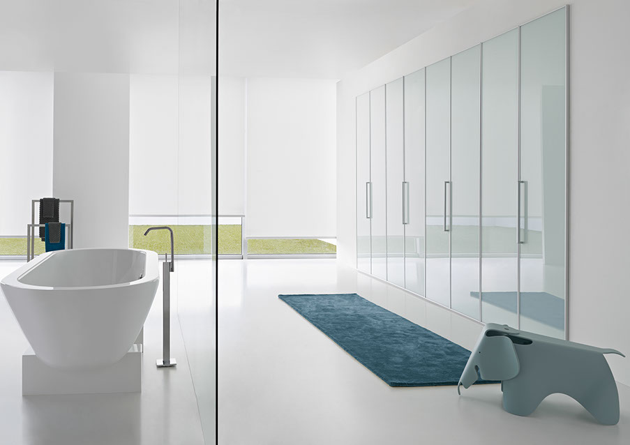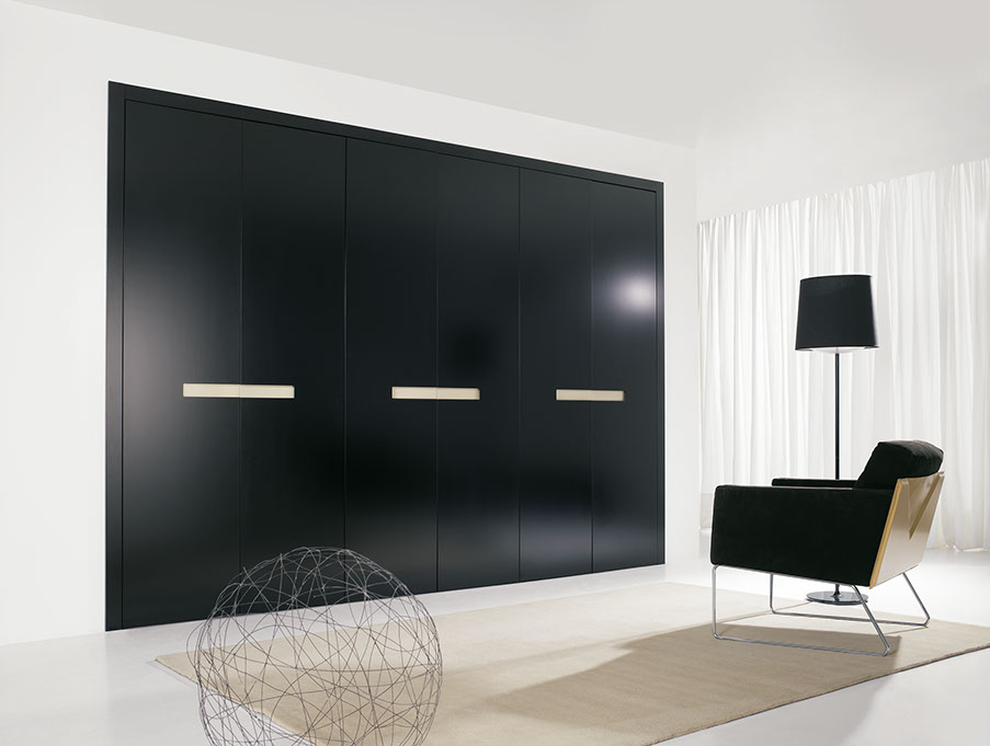 Portes battantes mod. P1 en panneau de 19 mm laqué C027 satiné; poignée réf. NM laqué C021 satiné.