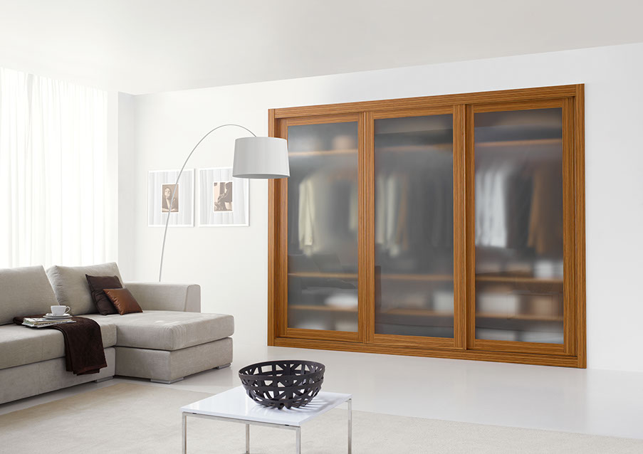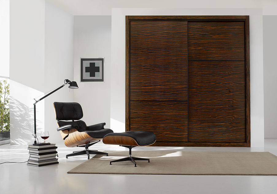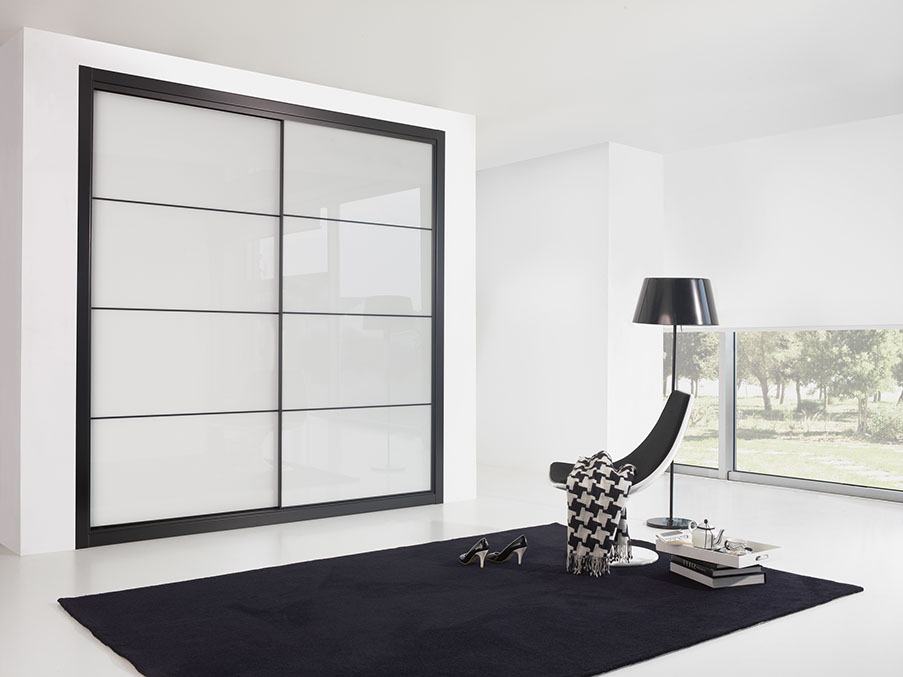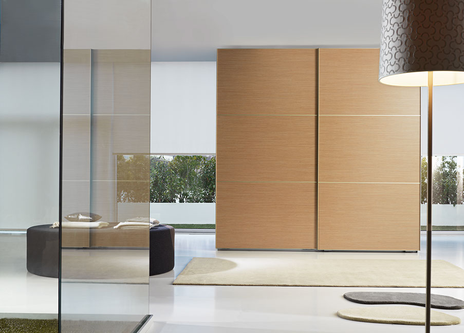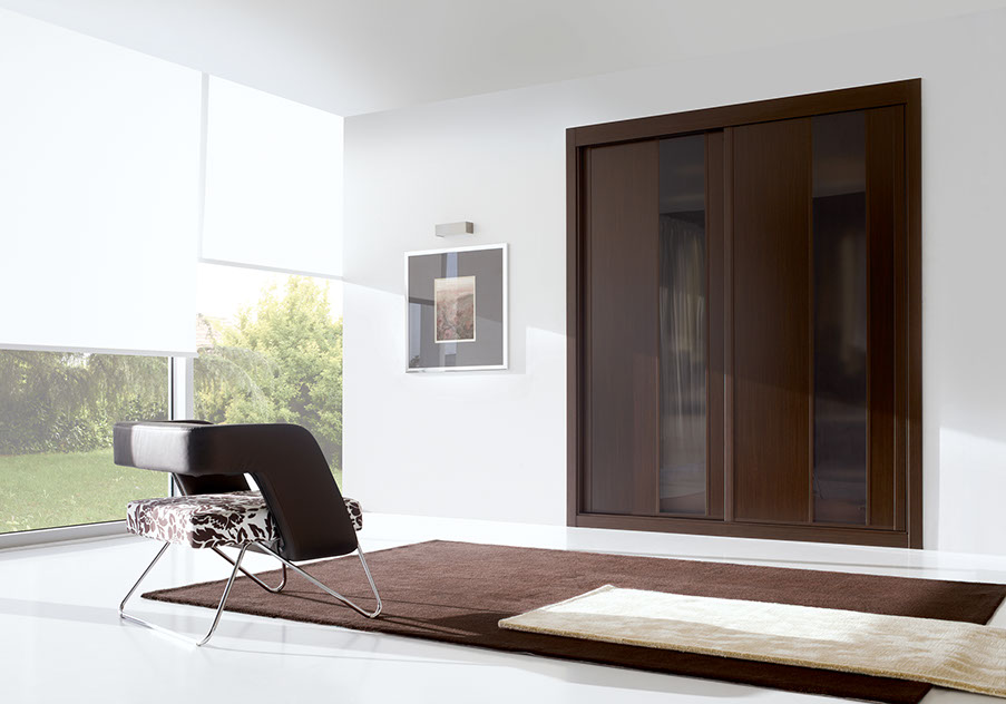 Portes coulissantes mod. P1m en verre dépoli trempé de 4mm; profil poignée série 400 plaqué bois zébrano RW et cadre de 70mm.