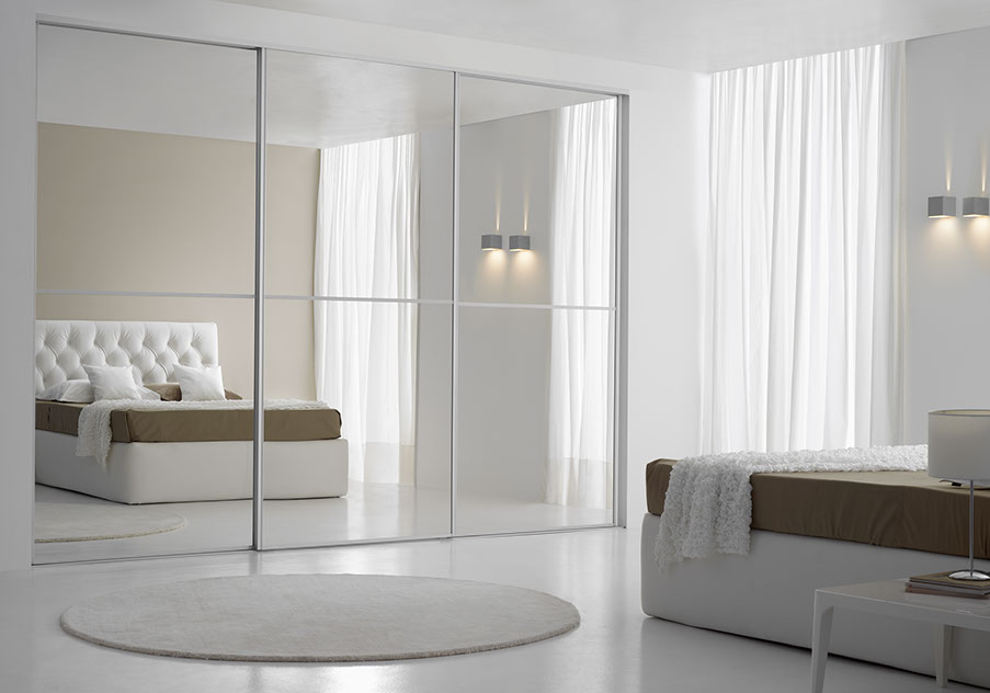 Portes coulissantes mod. P2 en miroir argent 4 mm; profil poignée série 400 anodisé argent et profil de transition 20 mm.
