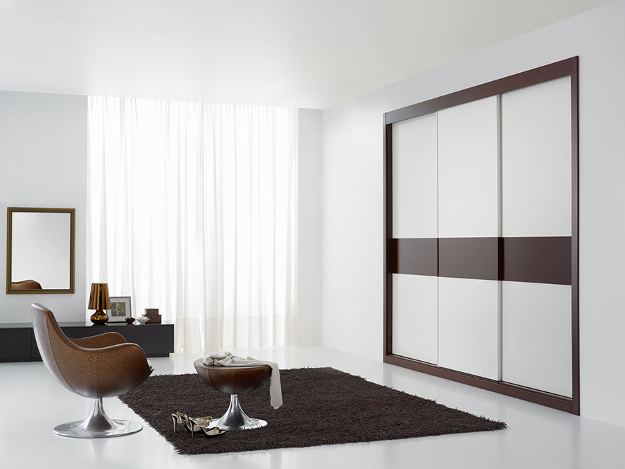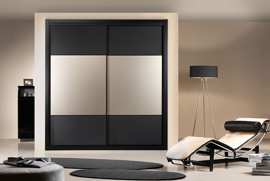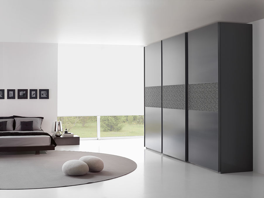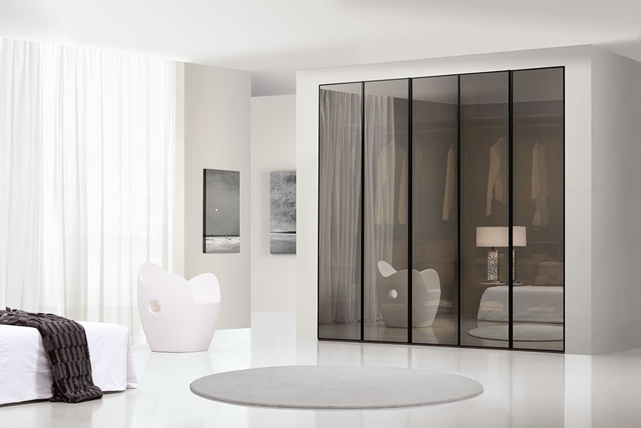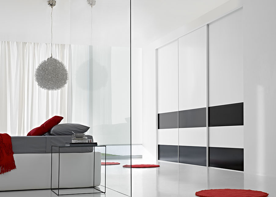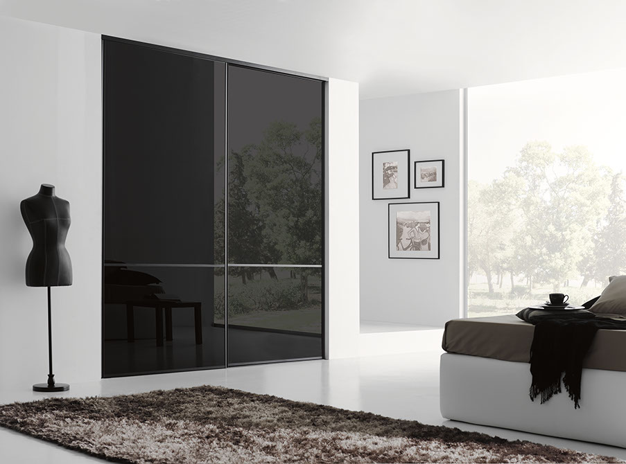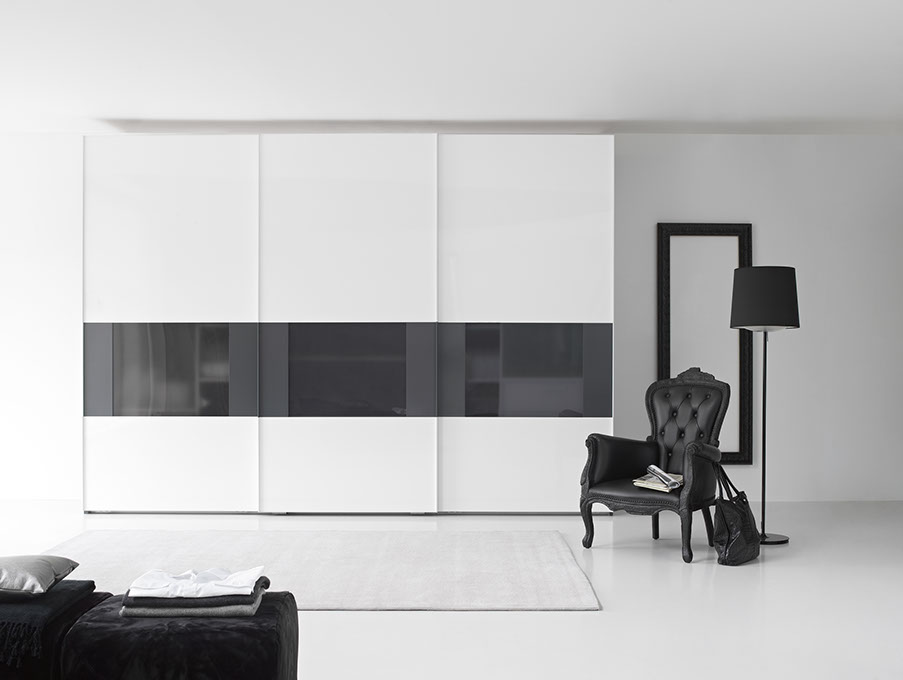 Portes coulissantes mod. P3e en panneau laqué (C019 / C013) brillant et verre gris trempé de 4 mm; profil poignée série 300HR laqué (C019 / C013) brillant.