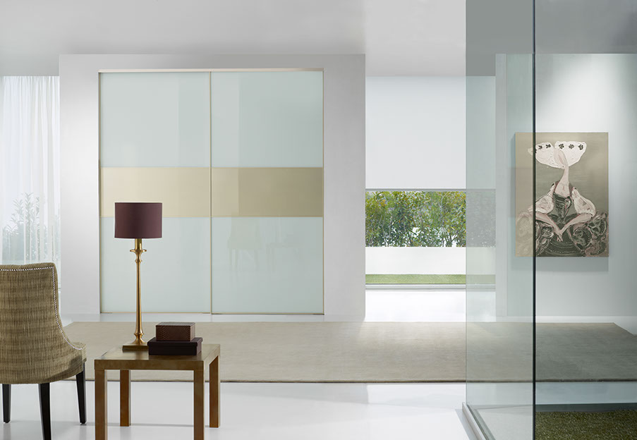Portes coulissantes mod. P2a en verre laqué de 4mm; profil poignée série 400 laqué C027 mat et profil de transition de 20mm.