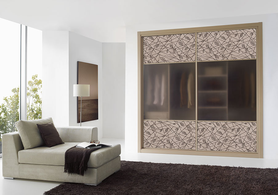 Portes coulissantes mod. P3c en verre bronze trempé de 4mm, avec application de tissu; profil poignée série 400 laqué C023 mat et profil de transition de 20mm.