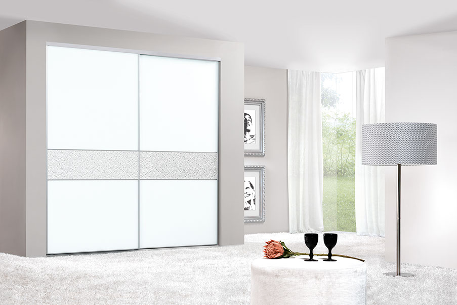 Portes coulissantes mod. P3d en verre laqué C013 dépoli de 4mm et bande central en panneau LL floral white/silver matt; profil poignée série 550 anodisé argent et profil de transition de 10mm.