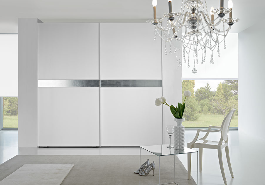 Portes coulissantes mod. P3a en panneau laqué C013 et bande central en vinyle argent; profil poignée série 300HRanodisé argent et profil de transition de 10 mm.